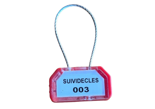 Pour l'attribution d'une clé ou d'un trousseau de clés, produit complet comportant un câble de 1.5mmx100mm résistance 150kgs une fois verrouillé, une numérotation unique et une puce NFC